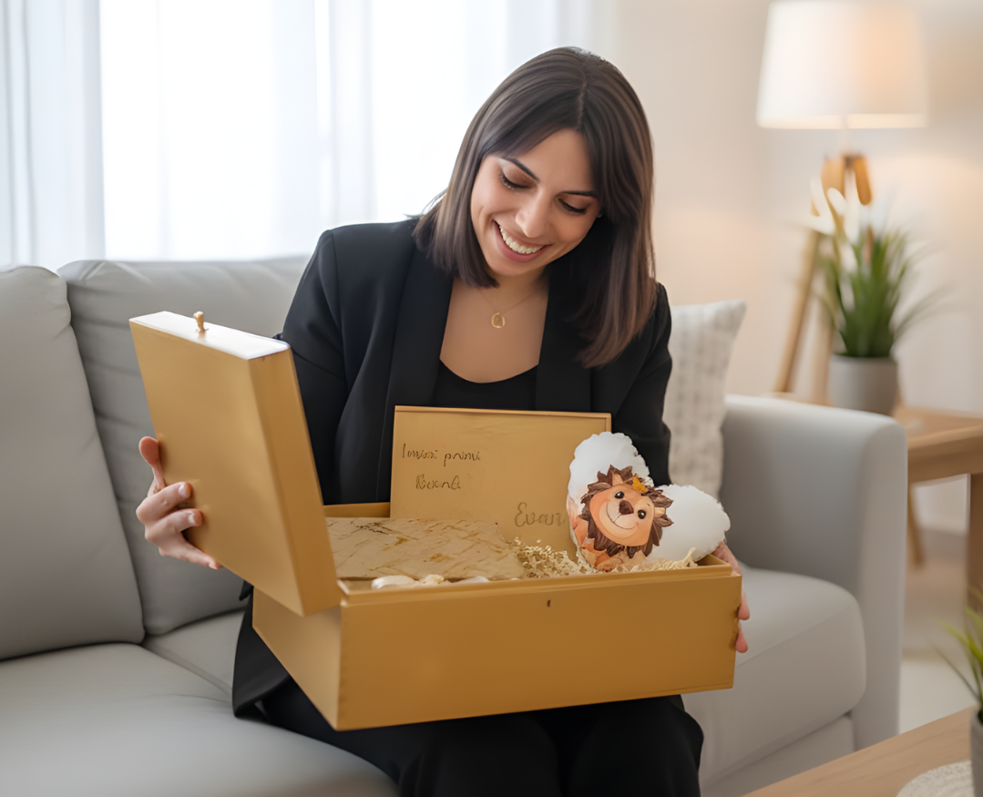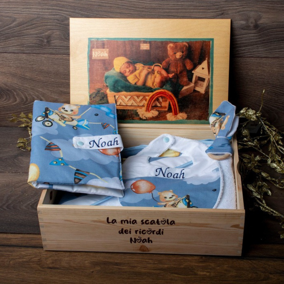 Ogni box può essere personalizzata con il nome del bambino e grafiche delicate, rendendola un ricordo che resta nel tempo.